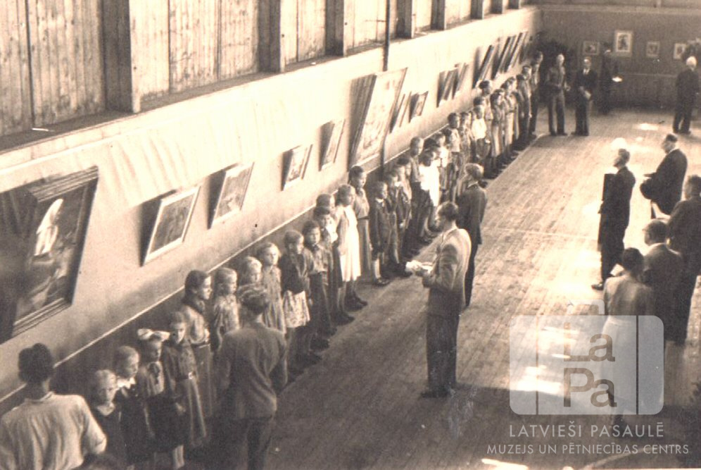 Tēlotājmākslas izstāde Valkas nometnē Nirnbergā (amerikāņu zonā). Bērni stāv garā rindā lielas zāles malā, pie sienas viņiem aiz muguras ir gleznas. Garām iet pieaugušie.