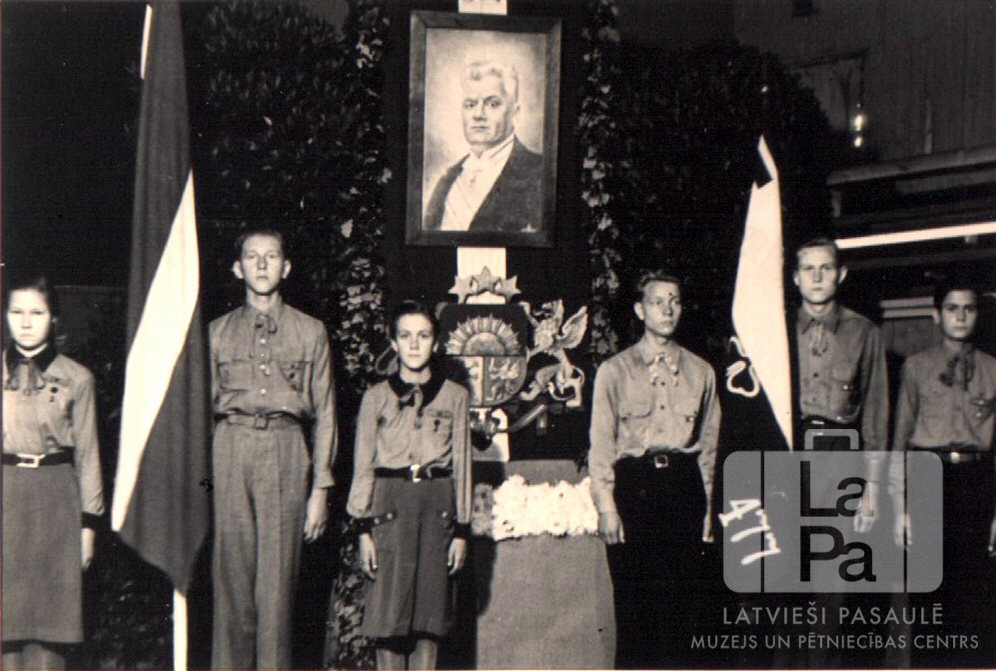 Mazpulcēni formastērpos stāv godasardzē tēlotājmākslas izstādes atklāšanas dienā Valkas nometnē Nirnbergā (amerikāņu zonā). Viens jaunietis tur Latvijas karogu, fonā Latvijas ģerbonis un Kārļa Ulmaņa portrets.