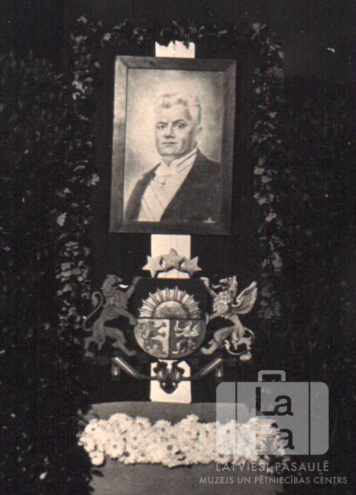 Gleznots K. Ulmaņa portrets virs Latvijas ģerboņa, apvīts ar lapu vītni.
