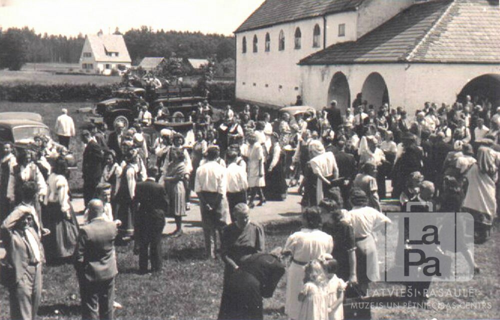 Ļaužu grupa pie baznīcas Franku novada dziesmu dienu laikā Fišbahā (amerikāņu zonā). Starp cilvēkiem ir redzamas vairākas automašīnas, tālumā – divstāvu ēka ar palīgēkām. Par šo gadījumu Harijs Saukants atceras: "1946. g. vasarā notika Franku novada latviešu dziesmu dienas. 30. jūnijā tās notika Fišbachā, 7. jūlijā Baireitā, 21. jūlijā Ansbachā un 4. augustā Eichštetē. Dziedāju Arnolda Kalnāja vadītā "Dziesmu Vairogs" korī un tad arī piedalījos visās šais dziesmu dienās."