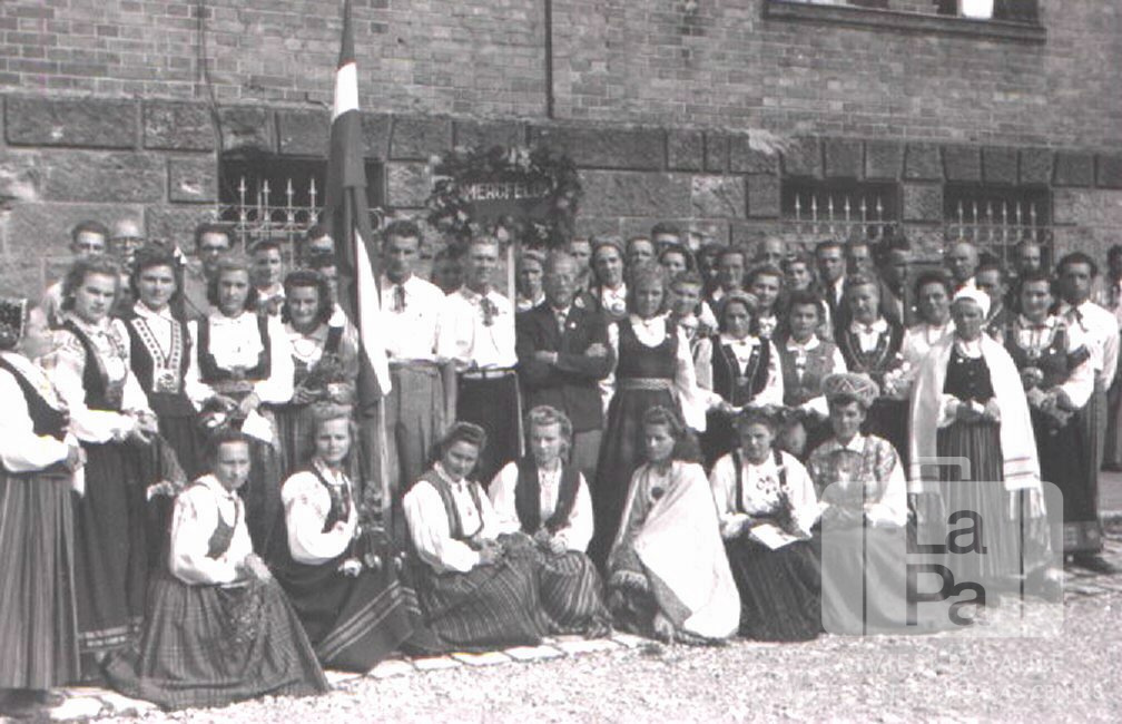 Nirnbergas Valkas nometnes kora "Dziesmu Vairogs" dalībnieki tautastērpos un uzvalkos pie mūra ēkas sienas Ansbahā (amerikāņu zonā), Franku novada dziesmu dienu ietvaros. Grupas vidū viens vīrietis tur Latvijas karogu, otrs tur zīmi ar uzrakstu "MERCFELDA".
