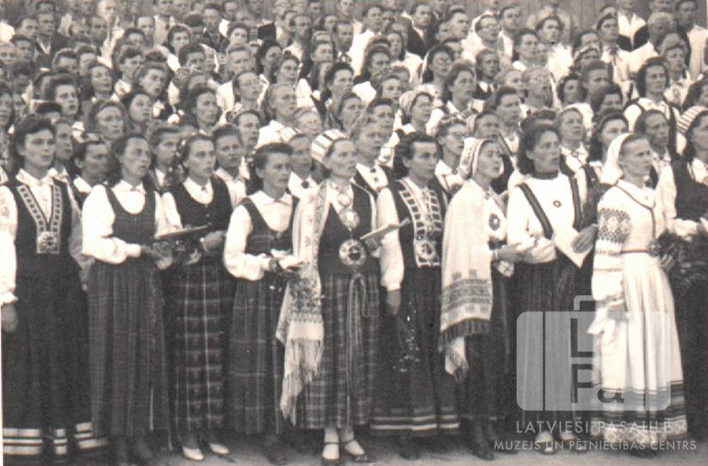Kopkora dalībnieki Franku novada dziesmu dienās Ansbahā (amerikāņu zonā). Priekšējās rindās dzied sievietes tautastērpos, aizmugurē ir vīri gaišos kreklos un tumšos uzvalkos. Pirmajā rindā vairākām sievietēm rokās ir dziesmu grāmatas.