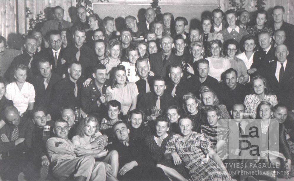 Nirnbergas Valkas nometnes kora "Dziesmu Vairogs" dalībnieki savas vizītes laikā Fišbahas nometnē (amerikāņu zonā). Liela ļaužu grupa svinīgos tērpos vairākās rindās.