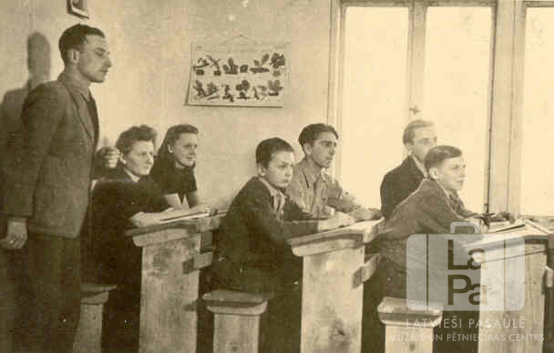 Latviešu pamatskolas 6. klases skolēni sēž klases solos pie loga Vatenštetes nometnē netālu no Braunšveigas (angļu zonā). No kreisās: pirmais ? Spaile (skolotājs), ceturtais Ilmārs Birznieks, piektais Harijs Zikmanis (pie loga).