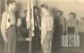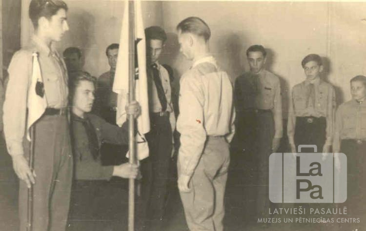 Liepājas 57. skautu vienības virskopnieks, nometies uz ceļa, saņem vienības jauno karogu Vatenštetes nometnē netālu no Braunšveigas (angļu zonā). Aizmugurē ierindā stāv skautu zēni formastērpos. Priekšā, pirmais no kreisās: kopnieks Harijs Zikmanis (ar Lūšu kopa karogu).