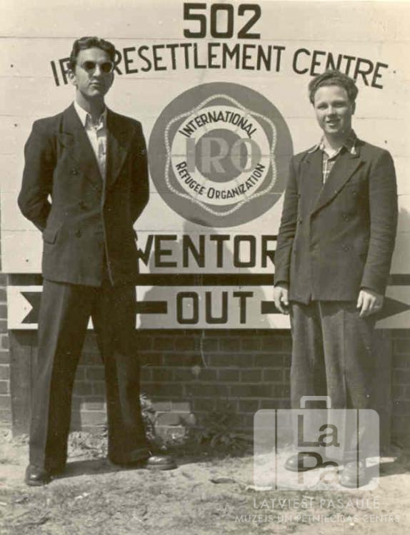 Divi jaunieši pie vārtu zīmes Ventorfas nometnē (angļu zonā) 1950. gada rudenī. Uz zīmes ir rakstīts: "502 / IRO RESETTLEMENT CENTRE / WENTORF / OUT". Zīmes vidū ir logo un teksts: "INTERNATIONAL/ IRO / REFUGEE ORGANIZATION". No kreisās: Harijs Zikmanis un Ojārs Āboliņš.