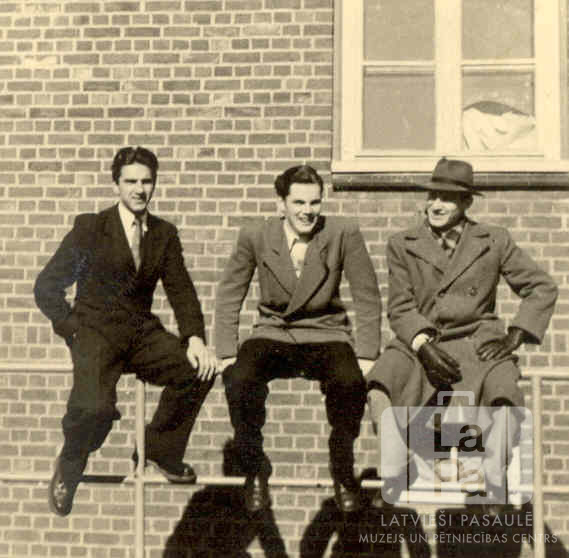 Trīs vīrieši sēž uz margām pie ķieģeļu ēkas Ventorfas nometnē (angļu zonā) 1951. gada pavasarī. Ēkas logam ir viena tukša stikla rūts. No kreisās: Harijs Zikmanis, Edgars Zariņš un nezināms. Par šo gadījumu Harijs Zikmanis atceras: "Izceļošanas process uz ASV dīpīšus no angļu zonas noveda IRO caurbraukšanas nometnē Ventorfā netālu no Hamburgas. Izceļošanas medicīniskā, politiskā un konsulārā pārbaude parasti pieprasīja 3 līdz 5 nedēļas. Pēc tam ģimenes bija ceļā uz ASV vai atpakaļ uz savu DP nometni. Nometnē arī bija grupa ilgtermiņa iedzīvotāju. Mēs tādi bijām, tas nozīmēja, ka mums bija jauni draugi un draudzenes katras pāris nedēļas."