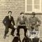 Trīs vīrieši pie ķieģeļu ēkas