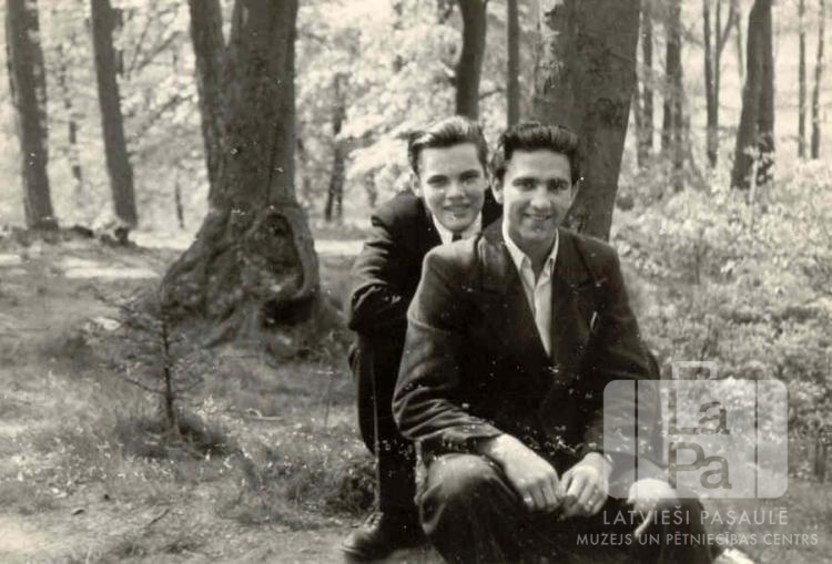 Divi jauni vīrieši parkā pie Ventorfas nometnes (angļu zonā) 1951. gada pavasarī. No kreisās: Edgars Zariņš un Harijs Zikmanis.