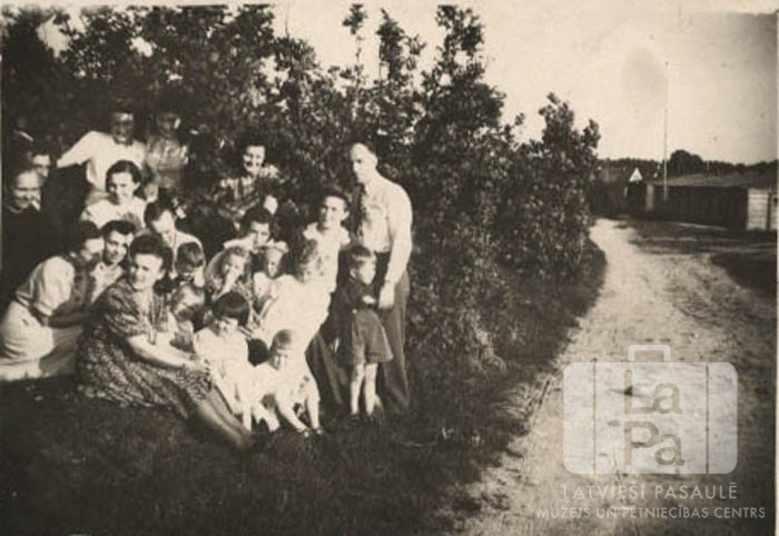 Ļaužu grupa ceļa malā Vasarsvētkos Švarcenbekā (angļu zonā). Aiz cilvēku grupas ir krūmājs. Labajā pusē tālumā redzamas vienstāvu koka barakas. Kreisajā pusē redzamas: Hermīne Rītiņš, ? Kurēns. No labās: pirmais ? Ķeris, otrais nezināms, trešā Anna Ķeris.