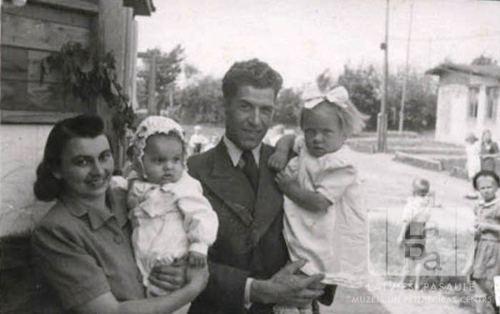 Vidiņu ģimene pie ēkas Švarcenbekas nometnē (angļu zonā). Vīrietim un sievietei katram rokās ir mazs bērns gaišā apģērbā. Fonā pastaigājas bērni, un ir redzama vienstāvu ēka.