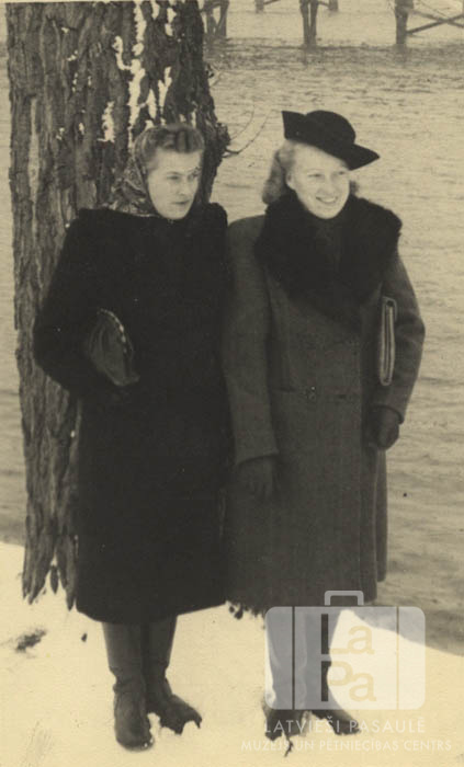 Māsas Cābeles mēteļos stāv pie koka ziemas laikā Neištatē (angļu zonā). No kreisās: Ruta Cābele un Dzidra Cābele. Sievietēm zem kājām sniegs, fonā ūdenstilpe.