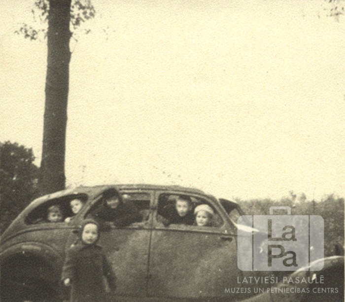 Bērni vecā automašīnas karkasā Švarcenbekā (angļu zonā). Mašīnas priekšā stāv mētelī saģērbies bērns.