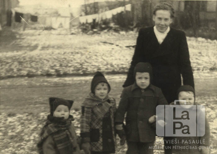 Hermīne Rītiņš ar bērniem Švarcenbekas nometnē (angļu zonā). Fonā ir apsnidzis pagalms, un veļa, kas izkārta uz auklām, nostieptām starp vienstāvu koka barakām. Priekšā, no kreisās: Valdis Ķeris, Gunta Ķeris, Juris Rītiņš, Jānis Rītiņš. Aizmugurē: Hermīne Rītiņš.