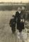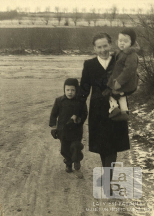 Sieviete ar diviem bērniem iet pa ceļu Švarcenbekā (angļu zonā). Priekšplānā, labajā pusē, uz zemes ir redzams sniegs. Fonā ir lauki un koku rinda. No kreisās: Juris Rītiņš, Hermīne Rītiņš, Jānis Rītiņš.