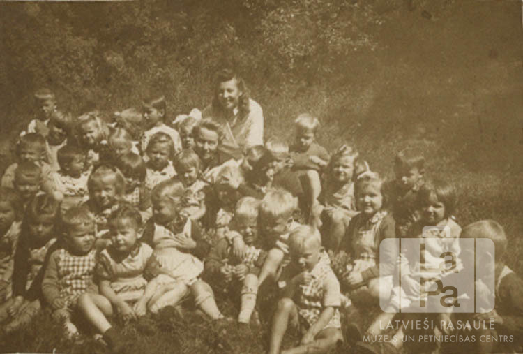 Fotogrāfijas dāvinātāja rakstītais atmiņu stāsts par bēgļu gaitām un bēgļu nometnēm: "1944. g. 28. jūlija rītā atstājām Bausku. 6.00 mūs pamodināja saucieni, ka Jelgava deg un krievi tuvojas. Tika padota vaļēja mašīna, un mēs braucām ar to līdz Iecavai. Bijām uzvilkuši ziemas mēteļus, sasvieduši vanniņā kaut kādas lietas. Iecavā vācu karavīri apturēja mašīnu un lika izkāpt, jo mašīnu vajagot armijas vajadzībām. Sākās panika. Tajā brīdī nāca nākamā mašīna, un karavīri aizskrēja pie tās. Šoferis nez kāpēc vērsās pie manis, vaicājot, ko darīt, un es teicu: "Brauciet!” Aizsedzu savus bērnus aiz bailēm, ka uz mums šaus, un mēs aizbraucām pa blakus ceļu. Vēl no Latvijas atceros epizodi, kad Airītēs, kur bija vācu štābs, lauzītā valodā prasīju pēc palīdzības, jo pie Priekules jau tuvojās Padomju armija. Man apsolīja pajūgu uz Liepāju. Piepeši viens vācu virsnieks sāka runāt latviski. Viņš bija, neatminu vairs, vai nu no Līveniem vai Medemiem. Viņš teica, salīdzinot padomju un vācu režīmus: "Tie paši vēži, tikai citā kulītē. Tomēr Vācijā jums būs drošāk.” 1944. gada 20. oktobrī izbraucām no Liepājas. Brauciens bija ar kuģi “Bukareste” no Liepājas uz Vēzeli Reinas krastā. Mūs ievietoja armijas barakās. Nāca amerikāņu uzlidojumi, un mums lika braukt tālāk. Bijām lielāka latviešu grupa, kas ar agronoma Blūmentāla padomu devās uz Meklenburgu. Cita latviešu grupa aizbrauca uz Drēzdeni. Mēs braucām cauri Berlīnei. Berlīnē palikām uz vienu nakti apakšzemes patversmēs. Otru nakti mums neļāva tur palikt, un tas bija liktenīgi, jo to sektoru sabumboja. No Berlīnes uz Meklenburgu pie Neištērlicas. Bijām lielā vācu muižā apmēram 30 cilvēki. Dzīvojām barakās, guļasvietas uz salmiem. Vīrieši strādāja lauku darbos. Tuvojās kara josla. Ar pajūgu atkal bēgām tālāk uz Šverīnu. Ceļā bija drausmīgi skati. Sabumboti ceļi, pajūgi, pa ceļiem tika dzīti koncentrācijas nometņu ieslodzītie. Bija šausmīgi skatīties, kā viņi no beigtajiem zirgiem centās plēst gaļu. Bet sargi ar pātagām dzina viņus tālāk. Šī briesmīgā aina ir palikusi manā atmiņā. Šverīnā mana ģimene apmetās ķieģeļu ceplī. Pēc laiciņa mūs atkal sāka formēt grupās un deva mašīnas, lai pārvietotu tālāk. Tas bija ceļš uz Švarcenbeku. Švarcenbekā vienu brīdi uzturējāmies lidmašīnu fabrikā. Gulējām starp visādām iekārtām. Kad blakus fabrikai atbrīvojās strādnieku barakas, tad tur arī tika ievietoti bēgļi. Nometnē bija apmēram 1000 bēgļu. Pirmais komandants bija Veilands. Švarcenbekā tikām 1945. gada pavasarī. Mūsu ģimenē bez manis vēl bija vīrs Genriks Rītiņš, divi mūsu dēli Juris un Jānis un vīramāte Anna Rītiņš. Vīrs Genriks pēc Bauskas krišanas pēdējā brīdī novilka formastērpu un kā zemnieks paguva mums pievienoties. Švarcenbekā tika sadalītas barakas, un mūsējā dzīvoja ģimenes ar bērniem. Bijām 4. barakā, kurā dzīvoja 20 ģimenes. Vīrs bija barakas vecākais. Cīnījāmies ar blaktīm, bet bijām drošībā. Attīstījās sabiedriskā dzīve – koris, teātris, skola, bērnu nodarbības, draudze. Nometnē bija mācītāji Sīpols un Līventāls. Vācijā, Hamburgā, piedzima mūsu trešais dēls Andrejs. Paliku Švarcenbekā līdz 1948. gada septembrim. Vīrs darbos uz Angliju aizbrauca jau 1947. gada maijā. Viņš vispirms tika lauksaimniecības darbos, bet, tā kā ģimene bija liela, tad pārgāja uz raktuvēm, jo tur varēja vairāk nopelnīt. Pēc Švarcenbekas kādu laiku bijām Ventorfas caurlaides nometnē. Mums, visai ģimenei, bija ļoti grūti tikt uz Angliju, jo vīramāte vienmēr bija slima. Es kategoriski atteicos viņu atstāt. Un tā gadu un piecus mēnešus ar bērniem paliku vēl Vācijā. Ceturtais dēls Mārtiņš piedzima Anglijā. Mēs izvēlējāmies Angliju ar domu, ka tas būs tuvāk, kad mūsu lielajai ģimenei būs jābrauc atpakaļ uz Latviju."