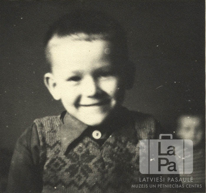 Jānis Rītiņš bērnībā Švarcenbekas nometnē (angļu zonā). Zēns mugurā ir adīta vestē ar tautiskiem rakstiem. Fonā ir redzams vēl viens bērns.