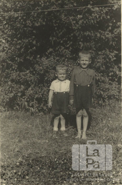 Brāļi Rītiņi bērnībā stāv meža malā Švarcenbekā (angļu zonā) 1946. gada vasarā. No kreisās: Juris Rītiņš, Jānis Rītiņš.