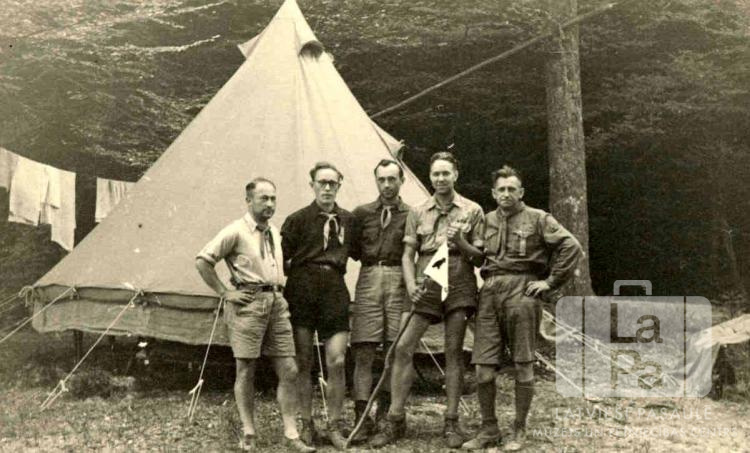 Vīrieši skautu formās no kursu Pūču kopa stāv pie savas telts skautu vadītāju Garezera kursu nometnē pie Kaseles (amerikāņu zonā). Aiz telts ir novilkta aukla ar izžautu veļu. Fonā mežs. No kreisās: ceturtais Imants Nīgals (ar karogu rokās), piektais Hugo Tērauds.