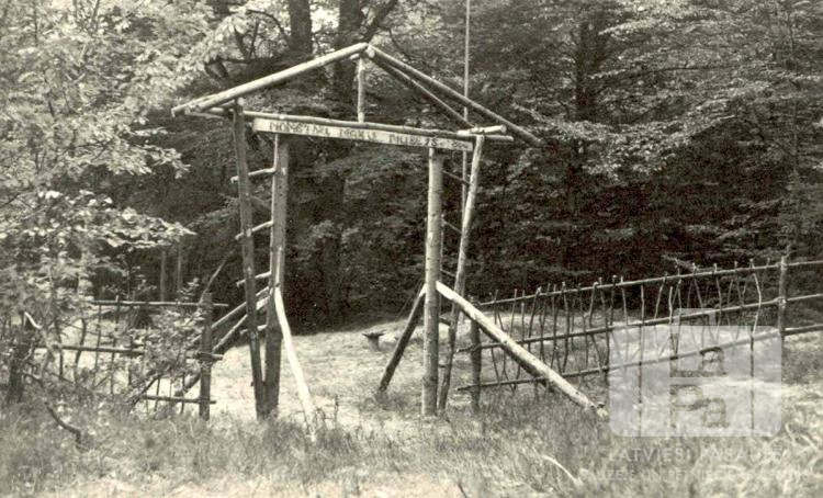No meža materiāliem būvēti skautu nometnes vārti ar žogu skautošanas meža māku nometnē pie Velerodes ciema netālu no Kaseles nometnes (amerikāņu zonā) 1947. gada vasarā. Šī nometne atradās blakus Garezera kursu nometnei. Virs vārtiem ir nesalasāms uzraksts. Fonā mežs.