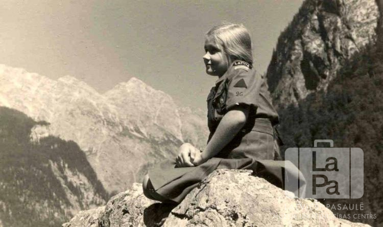 Vita Tērauda (pr. Kākule) 10 gadu vecumā Gaujas 26. gaidu vienības formastērpā sēž uz akmens Kaseles nometnes (amerikāņu zonā) tautskolas izbraukumā uz Berghtesgādeni (Berchtesgaden). Fonā kalnu grēdas un mežiem apaugusi kalna nogāze.