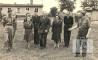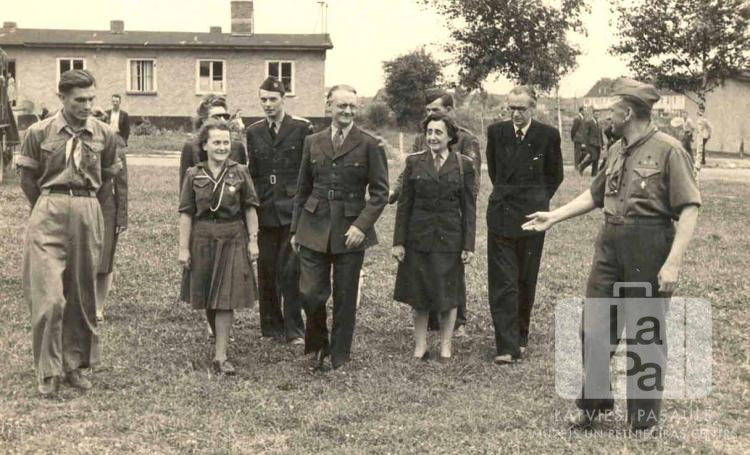 Pārstāvji no organizācijas "United Nations Relief and Rehabilitation Administration" (UNRRA) apskata Burtnieku 71. skautu un Gaujas 26. gaidu vienību Kaseles nometnē (amerikāņu zonā) 1946. gada rudenī. Fonā, labajā pusē, vienstāvu ēka. Pirmajā rindā, no kreisās: pirmais skautu vadītājs ? Strazdiņš, otrais nezināms (gaidu vadītāja), trešais nezināms (UNRRAs pārstāvis), ceturtais nezināms (UNRRAs pārstāve), piektais Herberts Jurjāns (nometnes latviešu administrators) un sestais Hugo Tērauds (skautu vadītājs).