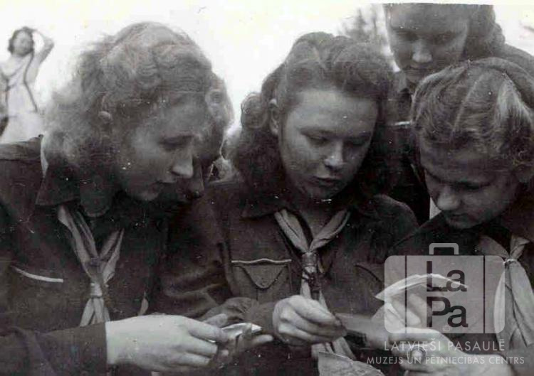 Piecas Gaujas 26. gaidu vienības gaidas formastērpos apskata dokumentus Kaseles nometnē (amerikāņu zonā) 1947. gada vasarā. Aiz viņām kreisajā pusē fonā stāv meitene gaišā tērpā.