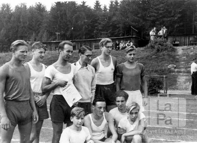 Puišu grupa gaišos sporta tērpos starp sacensībām Eslingenes nometnē (amerikāņu zonā) 1948. gada vasarā. Viens puisis rokās tur dokumentu (iespējams, diplomu/ atzinību). Fonā uz zemes ir redzamas novilktas sacīkšu laukuma līnijas, aiz tām uz nogāzes ir cilvēki, vienstāvu koka ēkas un mežs.