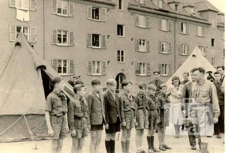 Skautu vadītājs Hugo Tērauds pārbauda Pērses 37. skautu vienības skautu ierindu Eslingenes nometrnē (amerikāņu zonā) 1948. gada vasarā. Aiz ierindas labajā pusē stāv skatītāji. Fonā ir uzceltas teltis un nometnes dzīvojamā ēka. Priekšplānā, pirmais no labās: Hugo Tērauds.
