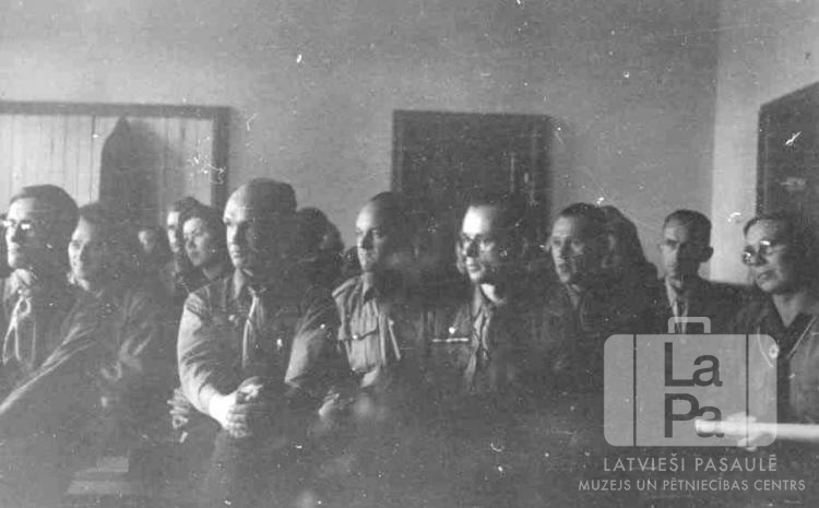 Cilvēki formastērpos sēž uz koka soliem zālē skautu vadītāju konferences laikā Ansbahas nometnē (amerikāņu zonā). Telpas aizmugurē, kreisajā pusē uz pakarināmā ir uzkārts apģērbs, vidū un labajā pusē ir divas durvis. Par šo gadījumu Hugo Tērauds atceras: "Vadītāju konferences laikā pieminēja Latvijas skautu organizācijas 30 darbības gadus."