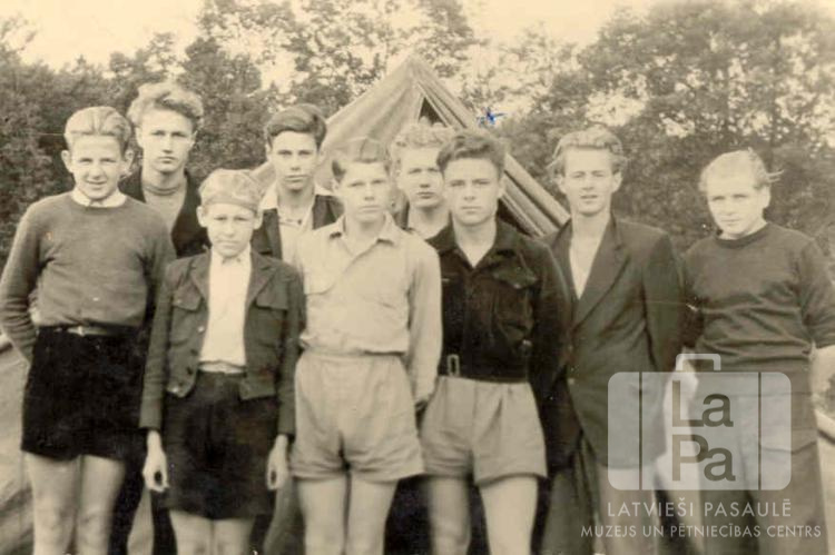 Staburaga 1. skautu vienības skauti no Mēsenes nometnes Lībekā (angļu zonā) stāv pie telts 1947. gada vasarā. Fonā mežs. No kreisās: trešais Indriķis Kaņeps un ceturtais Edvarts Abermanis.