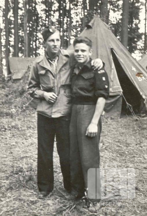 Divi Staburaga 1. skautu vienības skauti no Mēsenes nometnes Lībekā (angļu zonā) formastērpos skautu Beden Paula nometnē Timmendorfā pie Baltijas jūras no 1948. gada 17. līdz 27. jūlijam. Fonā vairākas teltis un mežs. No kreisās: Uldis Puriņš un Edvarts Abermanis.