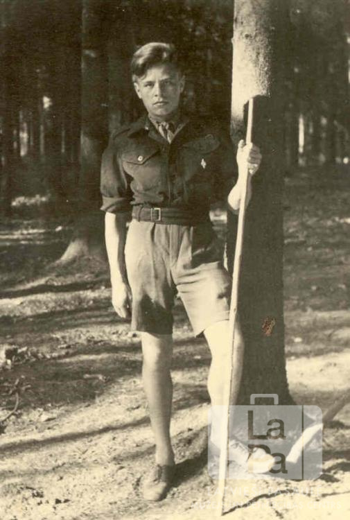 Staburaga 1. skautu vienības skauts Edvarts Abermanis no Mēsenes nometnes Lībekā (angļu zonā) 1947. gada vasarā. Skauts stāv formastērpā, viņam rokās ir nūja. Fonā mežs.