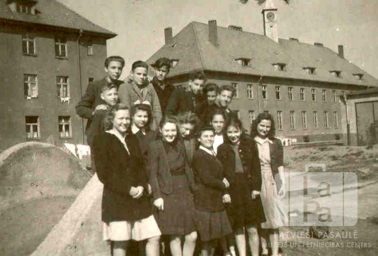 Ģimnāzijas draugi un draudzenes Mēsenes nometnē Lībekā (angļu zonā). Fonā nometnes dzīvojamās ēkas. Pirmajā rindā, no kreisās: Irēna Freimane, Rita Rozenberga, Ārija Lapsa, Inese Freija, Marija Jesčenko, Vīta Skulte, Maiguta Vīlipa un Anita Rituma. Aizmugurē, no kreisās: Ivars Leja, Aivars Stumbris, Edvarts Abermanis, Alfons Mednis, Rolands Neijs, nezināms un Uldis Puriņš.