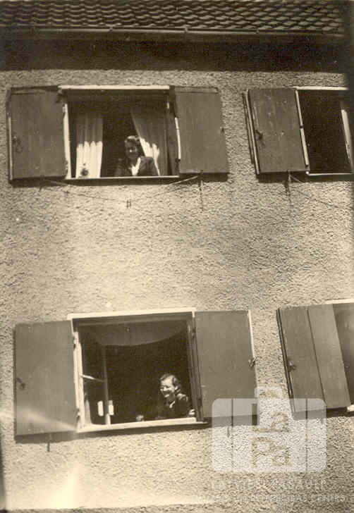 Divas sievietes raugās pa atsevišķiem logiem laukā no mūra ēkas Haunštetenes nometnē Augsburgā (amerikāņu zonā). Augšpusē ir redzams māla dakstiņu jumts. Augšējā logā ir redzama Elizabete Lenša, apakšējā logā: ? Maņģele.