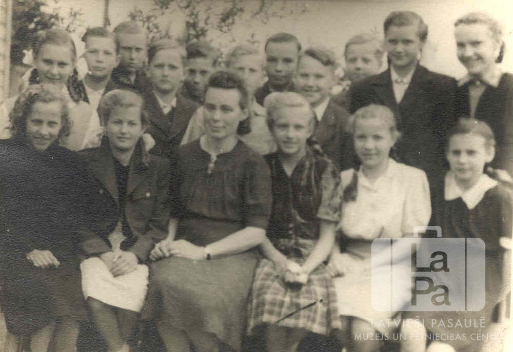 Latviešu pamatskolas piektās "A" klases skolēni ar skolotāju Haunštetenes nometnē Augsburgā (amerikāņu zonā). Priekšējā rindā, no kreisās: Rita Kalniņa, Mirdza Karele, Ludmilla Birne (skolotāja), Ilga Lenša, Valda Kalniņa un Margrieta Delviga. Aizmugurē, no kreisās: Inese Paegle, Valdis Liepiņš, Jānis Zutītis, Arnis Krīgēns, Andris Liepiņš, Imants Kalniņš, Daniels Alnis, Jānis Dimants, Olegs Rodko, Dzintra Līce un Ausma Demidova.