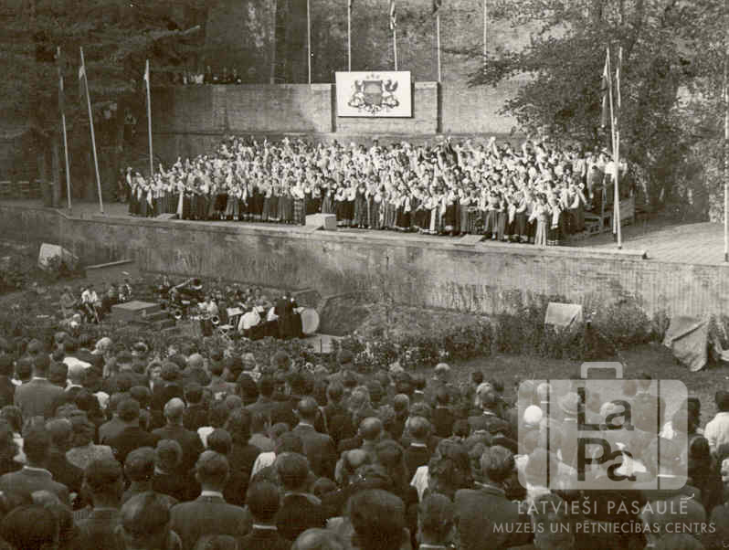 Dziesmu dienu kopkoris tautastērpos uz brīvdabas estrādes Augsburgā (amerikāņu zonā). Virs kopkora ir redzams liels Latvijas valsts ģerbonis. Abpus korim un aiz tā mastos plīvo Latvijas valsts karogi. Priekšplānā ir redzams skatītāju pūlis.