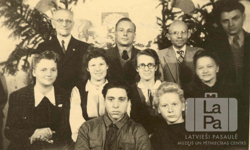 Pirmā gaidu un skautu vecāku padome Haunštetenes nometnē Augsburgā (amerikāņu zonā), gaidu vienību dibinot. Aizmugurē ir Latvijas valsts ģerbonis. Priekšā, pirmais no kreisās: ? Strēlis (skautu vadītājs). Otrajā rindā: pirmā ? Briede, otrā E. Zalgaucka (guntiņu vadītāja), trešā E. Lenša. Trešajā rindā, no kreisās: J. Kadelis, V. Lenšs, ? Dīnbergs un V. Valts.