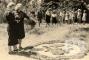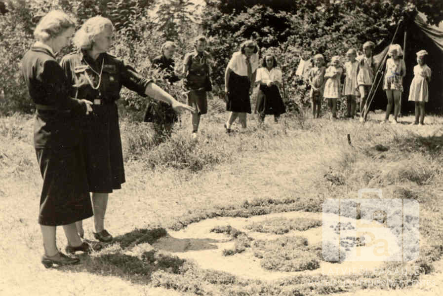 Rucavas 41. gaidu vienības vadītāja Zelma Lapsiņa no Haunštetenes nometnes Augsburgā (amerikāņu zonā) rāda amerikāņu gaidu vadītājai novadu nometnē izgatavoto gaidu zīmi, kuru bija gatavojušas gaidas no apkārtnē atrodamiem dabas materiāliem. Aizmugurē, meža malā pie telts, ir redzams guntiņu pulciņš, gaidot viešņas. Visas sievietes un meitenes ir ģērbušās gaidu formastērpos vai gaišos tērpos.