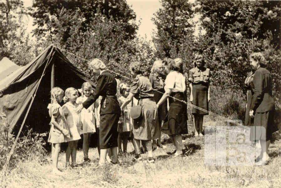 Amerikāņu gaidu vadītāja telts priekšā sasveicinās ar guntiņu ierindu novadu nometnē 1949. gada vasarā. Nometnē piedalījās arī Rucavas 41. gaidu vienība no Haunštetenes nometnes Augsburgā (amerikāņu zonā). Labajā pusē stāv vairākas sievietes. Visas sievietes un meitenes ir ģērbušās gaidu formastērpos vai gaišos tērpos.