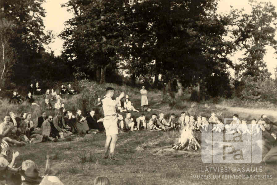 Skauti sēž pie novadu nometnes slēgšanas ugunskura 1949. gada vasarā. Nometnē piedalījās arī Rucavas 41. gaidu vienība no Haunštetenes nometnes Augsburgā (amerikāņu zonā). Blakus ugunskuram stāv vīrietis šortos. Fonā koki. Par šo gadījumu Ilga Abermane (dz. Lenša) atceras: "Fotogrāfijā var redzēt tikai vienu ceturto daļu no lielā nometņotāju apļa."