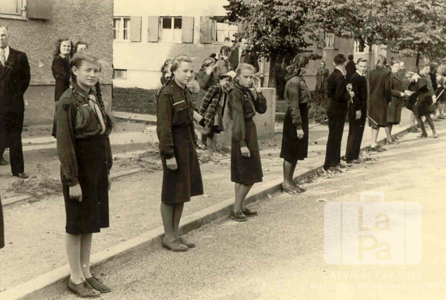 Rucavas 41. gaidu vienības gaidas kopā ar skautiem formastērpos stāv godasardzē ielas malā Augsburgā (amerikāņu zonā), sagaidot kādu ievērojamu viesi. Aizmugurē stāv skatītāji, aiz tiem ir vairākas dzīvojamās mūra ēkas. Ierindā stāv, no kreisās: pirmā Mirdza Karele, otrā Valda Kalniņa, trešā Elita Judovica.