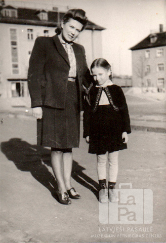 Švalbes ģimenes sievietes stāv uz ielas Ziemeļu nometnē Vircburgā (amerikāņu zonā). No kreisās: Irīna Švalbe un Ilze Švalbe. Fonā nometnes vairākstāvu mūra dzīvojamās ēkas.