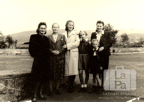 Sievietes un meitenes pie zemas akmens sienas Ziemeļu nometnē Vircburgā (amerikāņu zonā). Fonā klajš laukums, aiz tā ir pāris koki. Tālumā ir pauguraina ainava. No kreisās: trešā Renāte Janieks, ceturtā Antra Janieks, piektā Ilze Švalbe un sestā Irīna Švalbe.