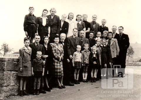 Kaimiņi un draugi pie zemas akmens sienas Ziemeļu nometnē Vircburgā (amerikāņu zonā). Bērni priekšā, no kreisās: Aija Olsons, Auseklis Olsons, Jānis Švalbe, Ivars Janieks, Ilze Švalbe, Antra Janieks, nezināms. Otrajā rindā stāv, no kreisās: pirmais Alfrēds Olsons, otrā Dzintra Olsons, ceturtais L. Albarings, piektais Pēteris Švalbe. Trešajā rindā (uz akmens sienas), no kreisās: otrā Irīna Švalbe, trešā ? Albaringa, ceturtā Liene Švalbe, piektais Renāte Janieks, astotais Herberts Janieks, devītais K. Kalējs.