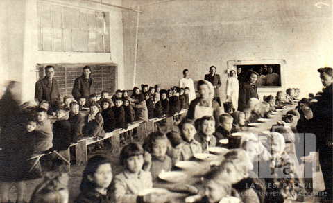 Bērnu mielasts pie diviem gariem galdiem Ziemeļu nometnes ēdamzālē Vircburgā (amerikāņu zonā). Bērni, ģērbušies mēteļos, ir sasēduši pie gariem galdiem un ēd no zupas šķīvjiem. Starp galdu rindām staigā pieaugušie.