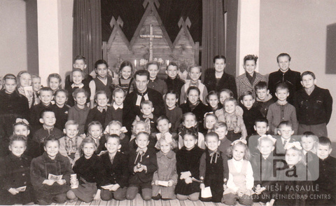 Bērnu un jauniešu grupa ar mācītāju pie altāra Ziemeļu nometnes baznīcā Vircburgā (amerikāņu zonā). Grupas vidū ir redzams mācītājs tērpā. Otrajā rindā, ceturtā no kreisās: Ilze Švalbe, trešajā rindā, otrais no labās: Jānis Švalbe, pēdējā rindā, otrā no labās: Aija Olsons. Par šo gadījumu Ilze Kalniņa (dz. Švalbe) atceras: "Baznīca bija iekārtota 3. bloka mājas bēniņos, kurai mākslinieks iztaisīja altāri un pielika bērza koka krustu. Trešās ēkas bēniņos ari bija skolas telpas."