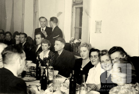 Cilvēki sēž pie gara galda svinību laikā Ziemeļu nometnes ēdamzālē Vircburgā (amerikāņu zonā). Uz galda ir ēdienu trauki, šķīvji un vīna pudeles. Vīrieši ir ģērbušies uzvalkos, sievietes – kleitās un blūzēs. Aiz galda ir siena, tās vidū ir logs, uz loga palodzes ir puķes. Otrpus galdam, vidū (no kreisās): Irīna Švalbe (punktotā kleitā ar balto apkakli) un Pēteris Švābe.