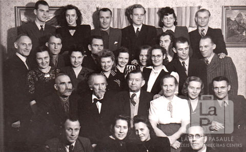 Dāmas un kungi fotografējas sarīkojumā Ziemeļu nometnē Vircburgā (amerikāņu zonā). Aizmugurē uz sienas ir divas gleznas, pa vidu aizkars. Pirmajā rindā, otrā no kreisās: Dzintra Olsons. Otrajā rindā, no kreisās: otrais Ludis Albarings, sestais Alfrēds Olsons. Trešajā rindā, trešā no kreisās: Irīna Švalbe. Ceturtajā rindā, no kreisās: otrais Pēteris Švalbe, piektais ? Albaringa. Pēdējā rindā, no kreisās: trešais Herberts Janieks, sestais K. Kalējs.