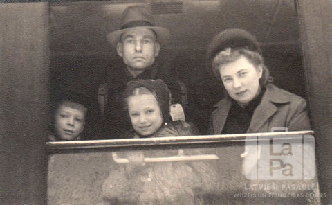 Švalbes ģimene skatās pa vilciena logu, atstājot Ziemeļu nometni Vircburgā (amerikāņu zonā) 1950. gada 2. februārī no rīta. No kreisās: Jānis Švalbe, Pēteris Švalbe, Ilze Švalbe un Irīna Švalbe. Par šo gadījumu Ilze Kalniņa (dz. Švalbe) atceras: "Švalbes ģimene izbrauc uz Gronas transītnometni, ceļā uz jauno dzīvi Amerikā. Ģimene apmetas Vašingtonas štatā, Amerikas rietumos, kur Pēteris strādāja "Pope Talbot" būvkoku firmā."